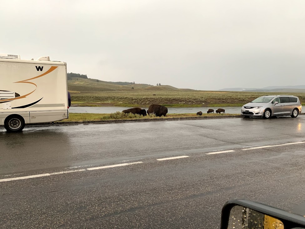 On the way back to the campsite from Old Faithful (about an hours drive, this place is giant.) We visited the Gibbon Falls lookout and got stopped by a bison!