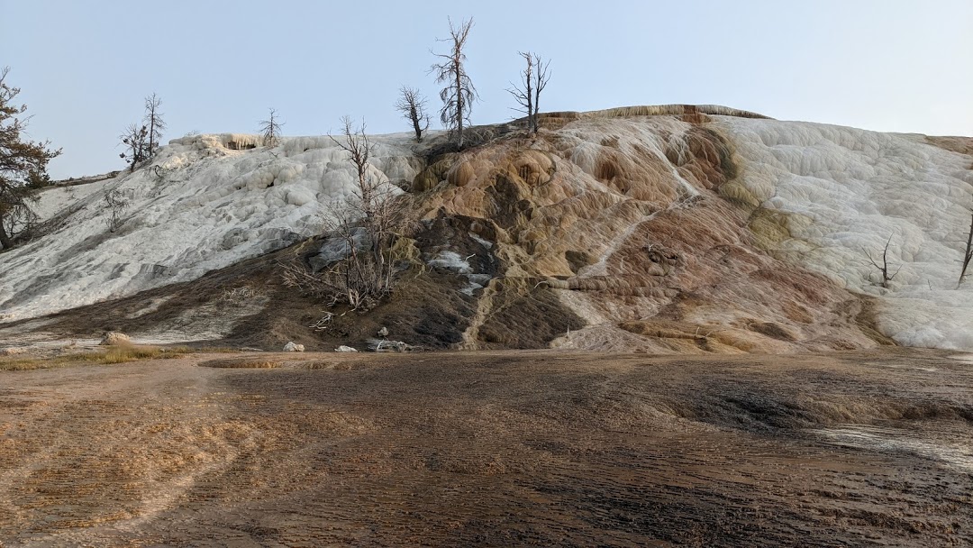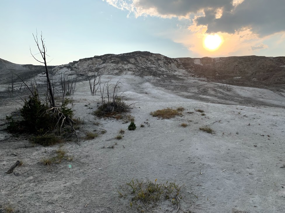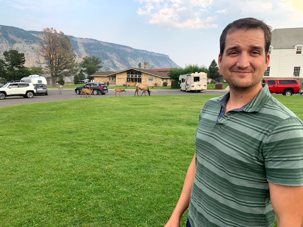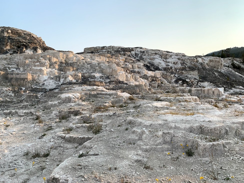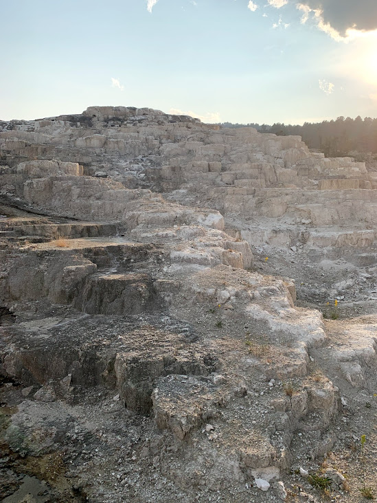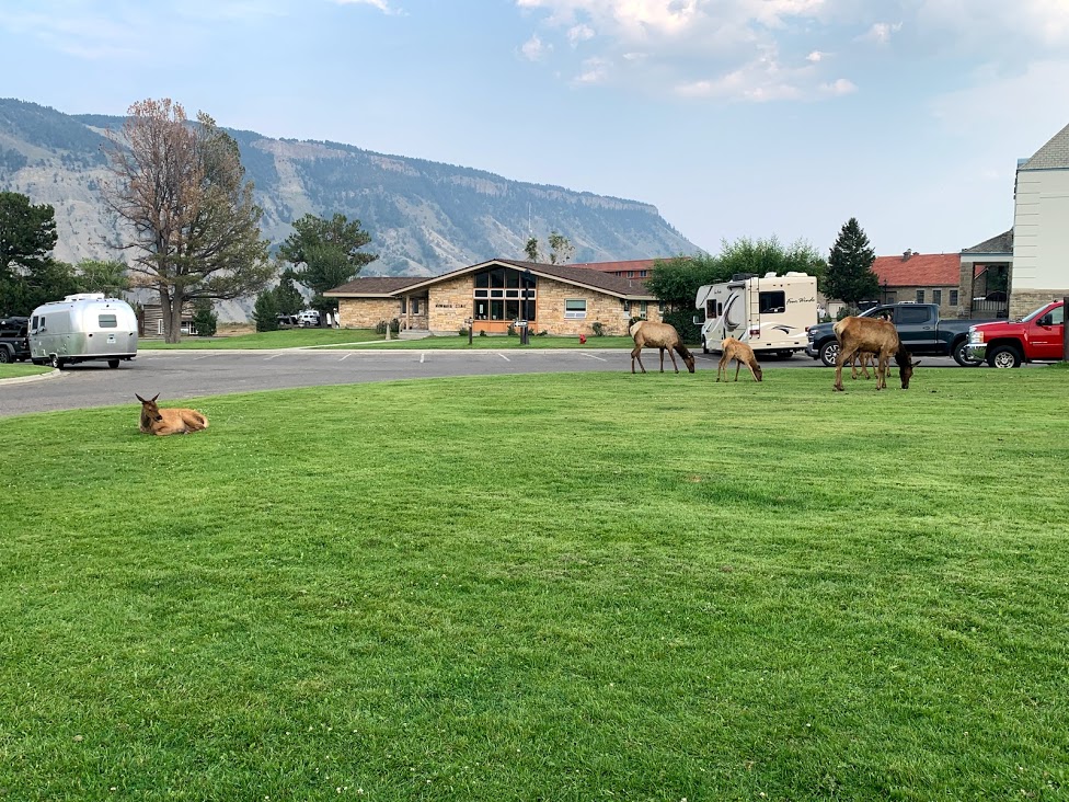 Mammoth Springs has a little town attached to it with a gas station, dining options, and I think even lodging. This little slice of civilization was about 15 minutes north of our campsite and had cell service so we were up in the area often. We managed to see some elk grazing in the development and they did not care about humans!