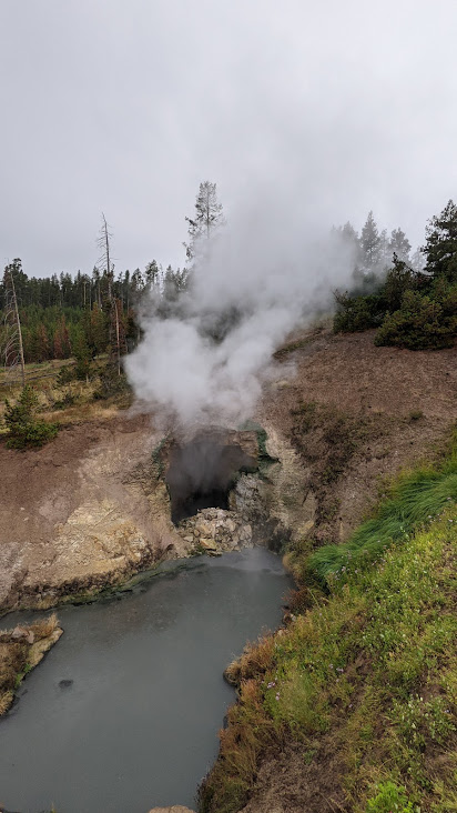 Dragon’s Mouth Spring was incredible. The water gurgled up and hit the sides of the wall of the cave and it actually sounded like a dragon breathing and snorting. We went during a cold, rainy day and the extra steam from this area did not disappoint. I would 100% suggest making a stop by this area if you’re in the park, especially if you have little ones or like dragons 😀